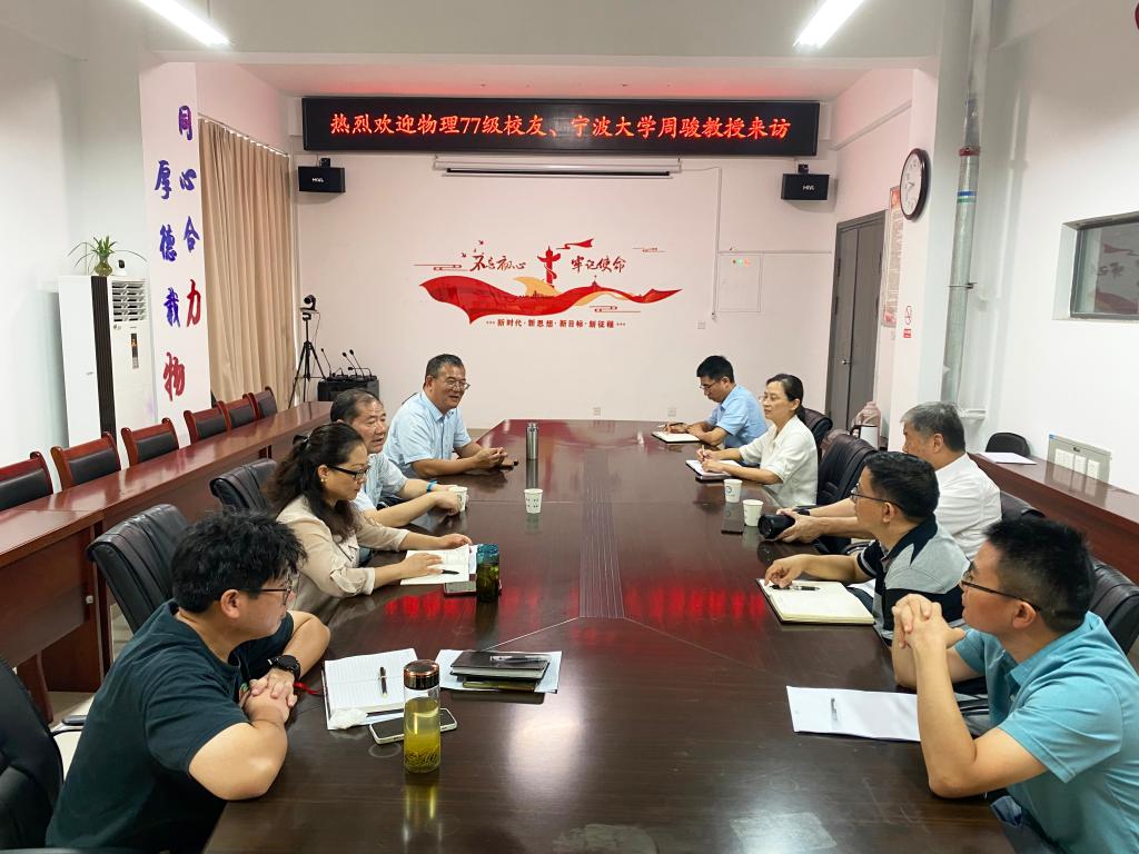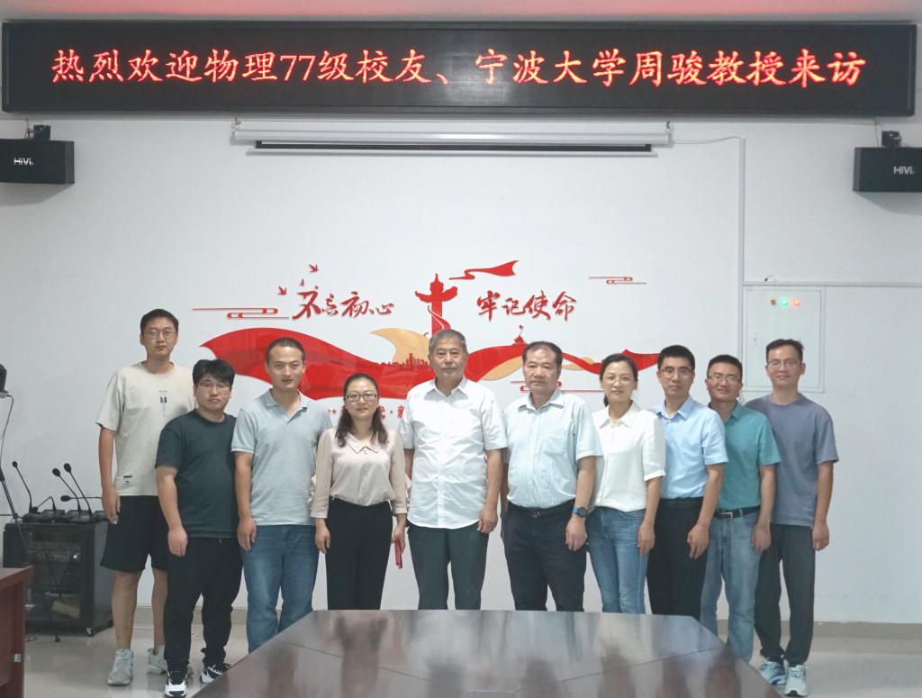 物理77级校友、宁波大学物理学院周骏教授荣归母校,到访力物学院。物理77级校友、力物学院退休教师顾广颐教授,学院领导、系主任、青年教师代表等参加了欢迎座谈会。座谈会由学院党委书记刘艳主持。