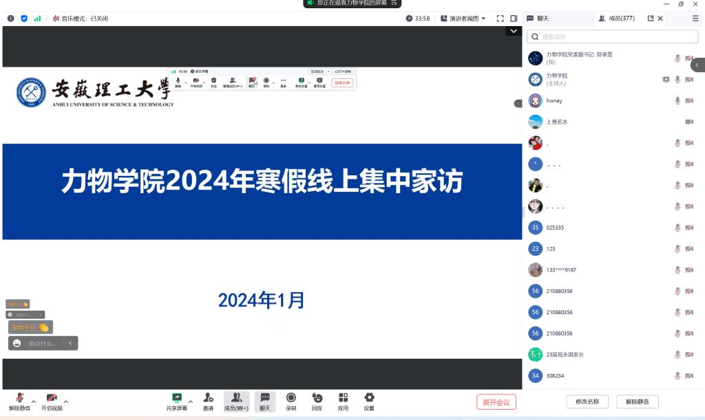 为深入贯彻习近平总书记关于教育的重要论述,落实立德树人根本任务,不断拓宽学生思想政治教育工作渠道,针对不同年级特点,1月30日-31日,力物学院通过线上方式分毕业班和非毕业班两种学生群体开展2024年寒假线上集中家访活动。学院学生工作负责人、全体辅导员、学生资助宣传大使,以及500余名学生家长参加会议。