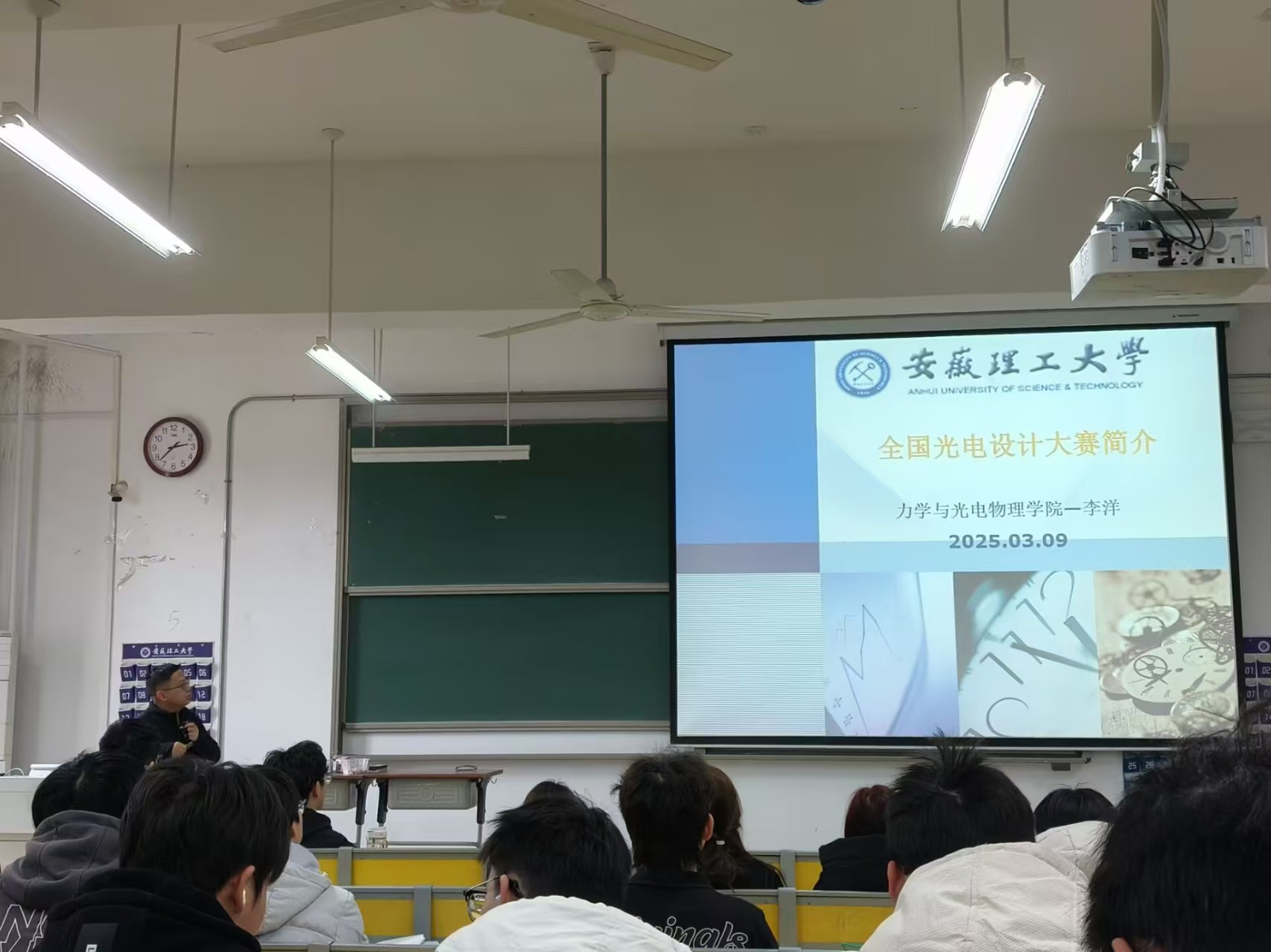 实验中心教工党支部书记符青山老师针对全国大学生物理实验竞赛的情况向大家进行介绍,他从命题类、自选类、讲课比赛类等三个不同比赛类别展开介绍,通过往年比赛的具体题目,帮助大家有了更加深刻和直观的认识。