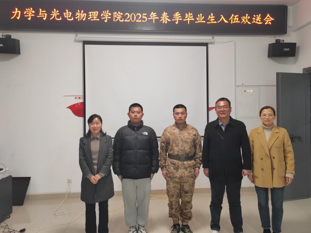 阳春三月送新兵,一身戎装踏征程。3月12日下午,力物学院在明道楼A320报告厅举行2025年春季大学生入伍欢送会,欢送学院即将启程奔赴军营的2名准新兵应届毕业生。学院党委书记孙东升、常务副院长高娟、党委副书记郑孝莲、毕业班辅导员、有应征意向的毕业班学生参加活动。