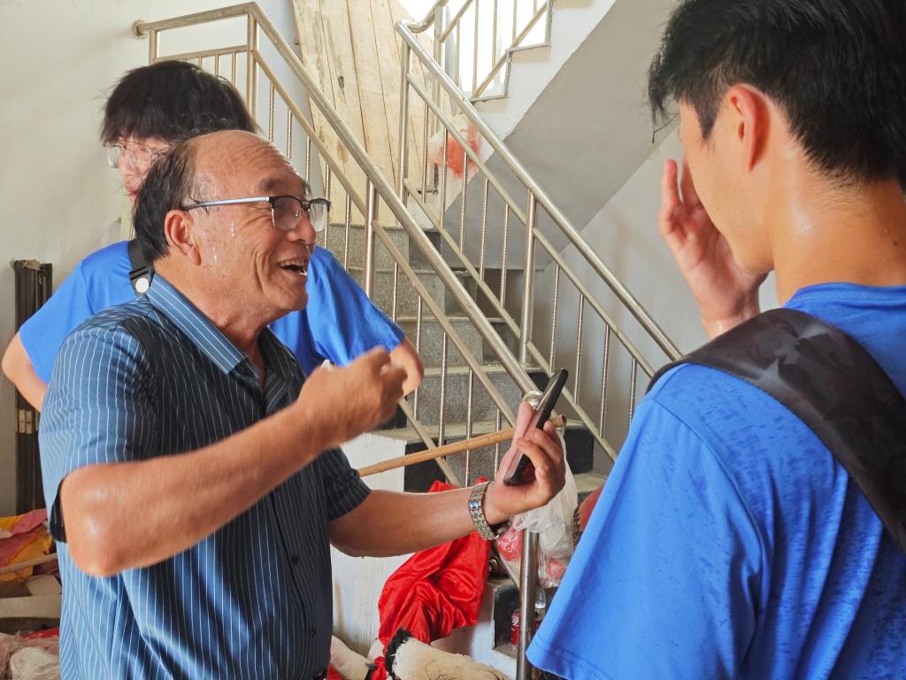 7月3日,团队来到了临泉“肘阁抬阁”非遗传承人刘子昌的家中。传承人带领团队成员参观了“肘阁抬阁”常用的服饰与道具,并向队员们介绍了“肘阁抬阁”的演出形式与发展历程。“我们临泉的肘阁抬阁是全国最具特色的,表演节奏非常欢快。”刘子昌先生自豪地说。
