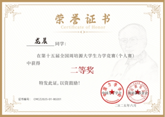 近日,第十五届全国周培源大学生力学竞赛(个人赛)获奖证书收悉,工程力学专业2023级龙晨同学斩获了全国二等奖,为九色视频